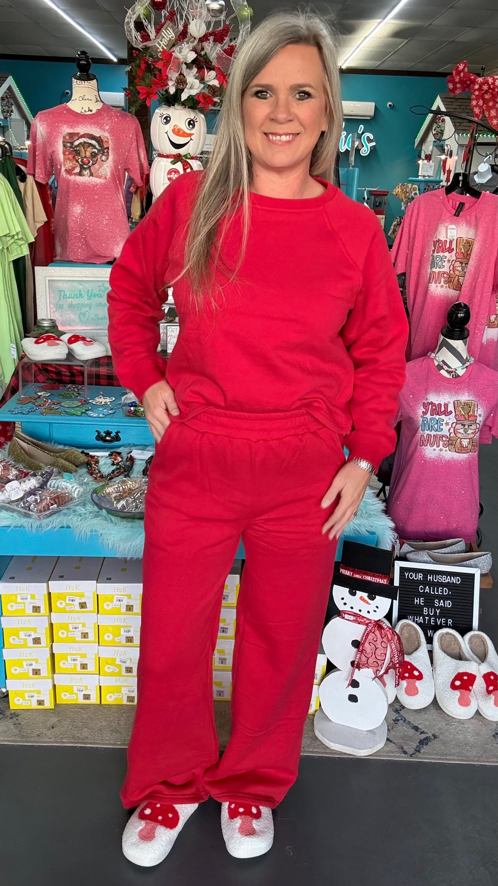 Made by Zenana. I’m wearing a medium. True to size fit. Super soft plushy fleece. Wide leg sweatpants. No drawstring. Pullover raglan style sweatshirt.