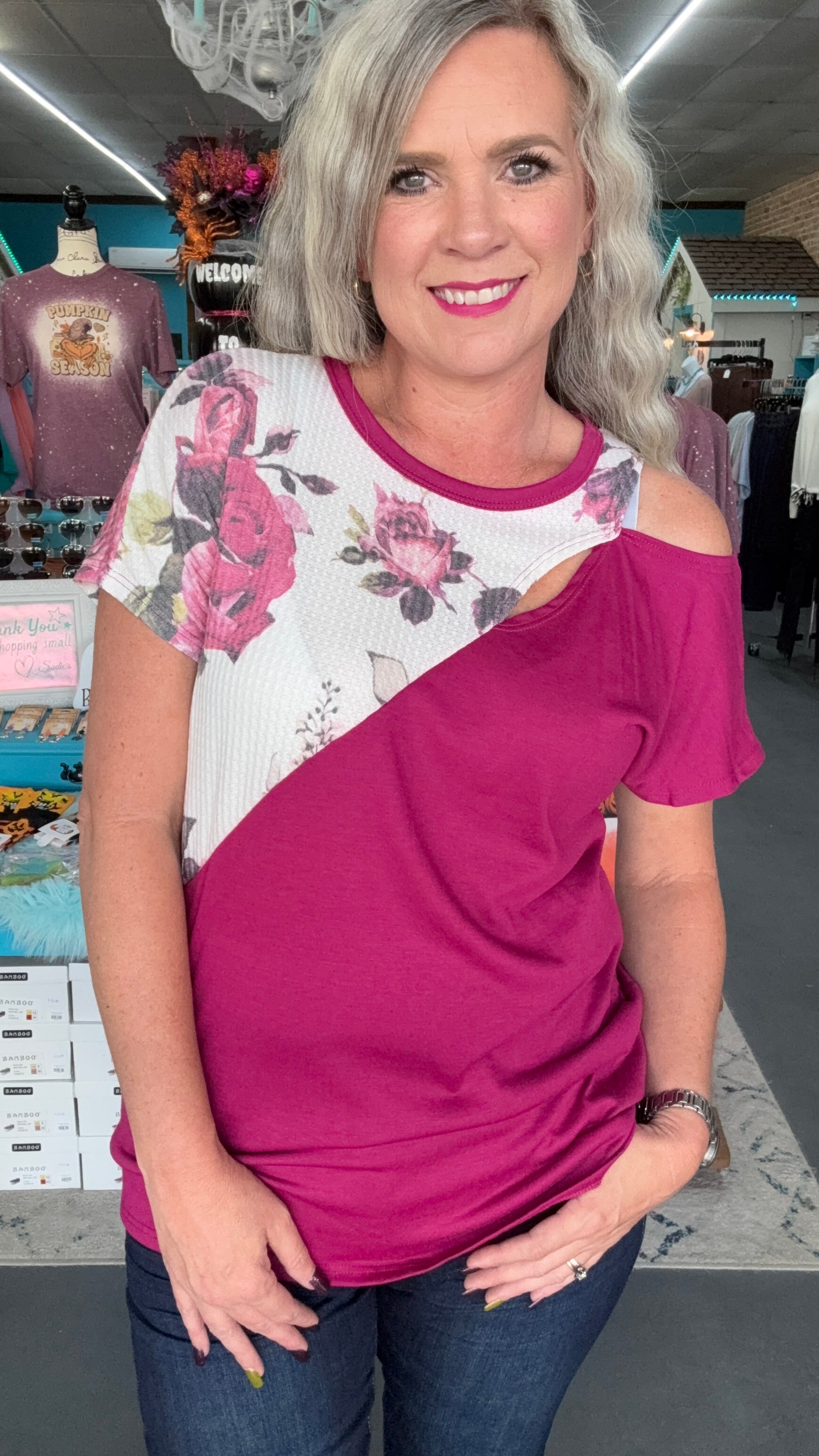 Made by Avery. It’s running a tad oversized. I’m wearing a small. Floral is a waffle knit. Magenta is a super soft rayon blend.