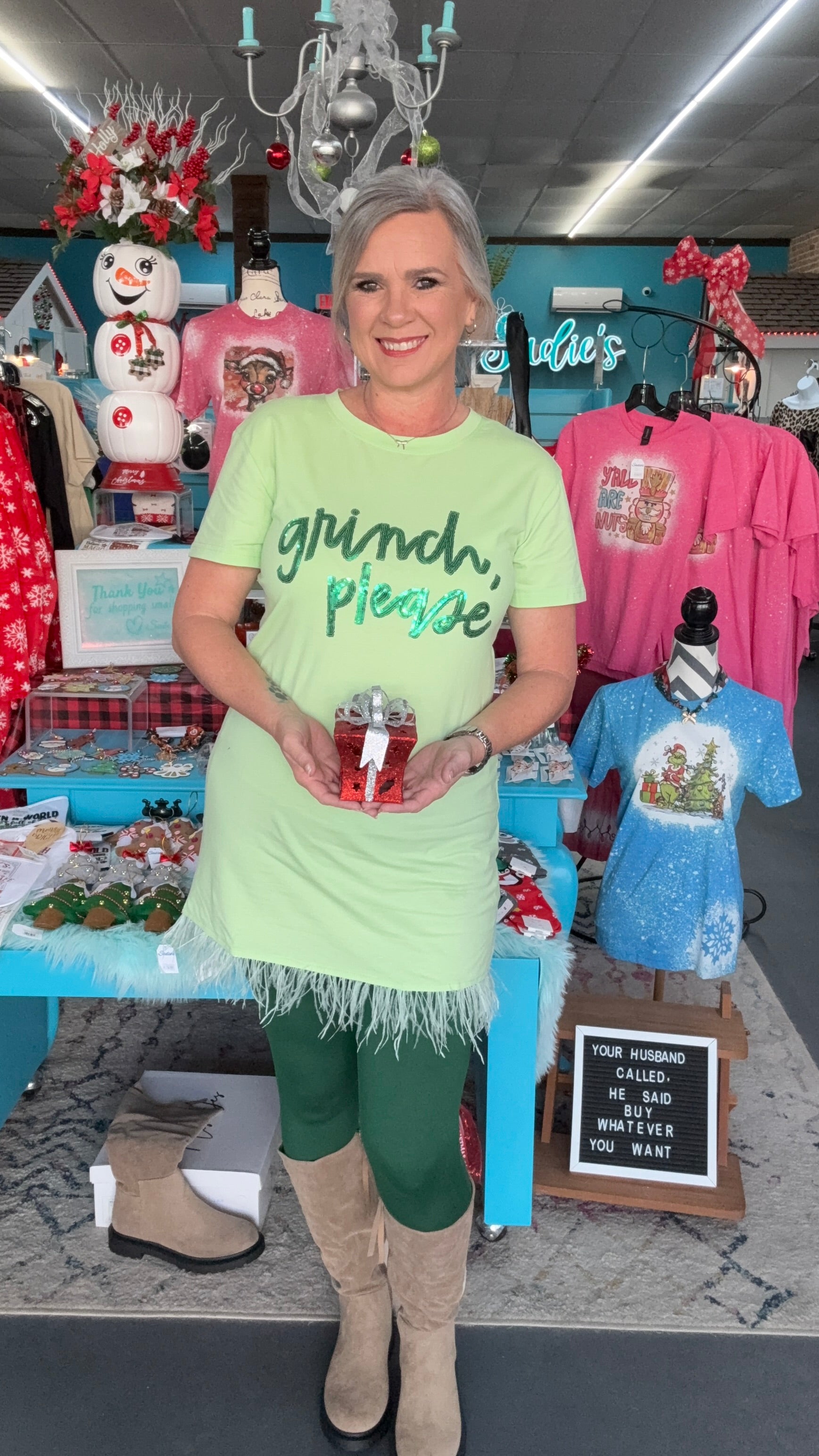 Wear as a dress or pajamas! It’s that comfy! True to size but go up for a looser fit. I am wearing a medium. Soft tshirt material. Made by Why Dress. So cute with our green Zenana leggings!