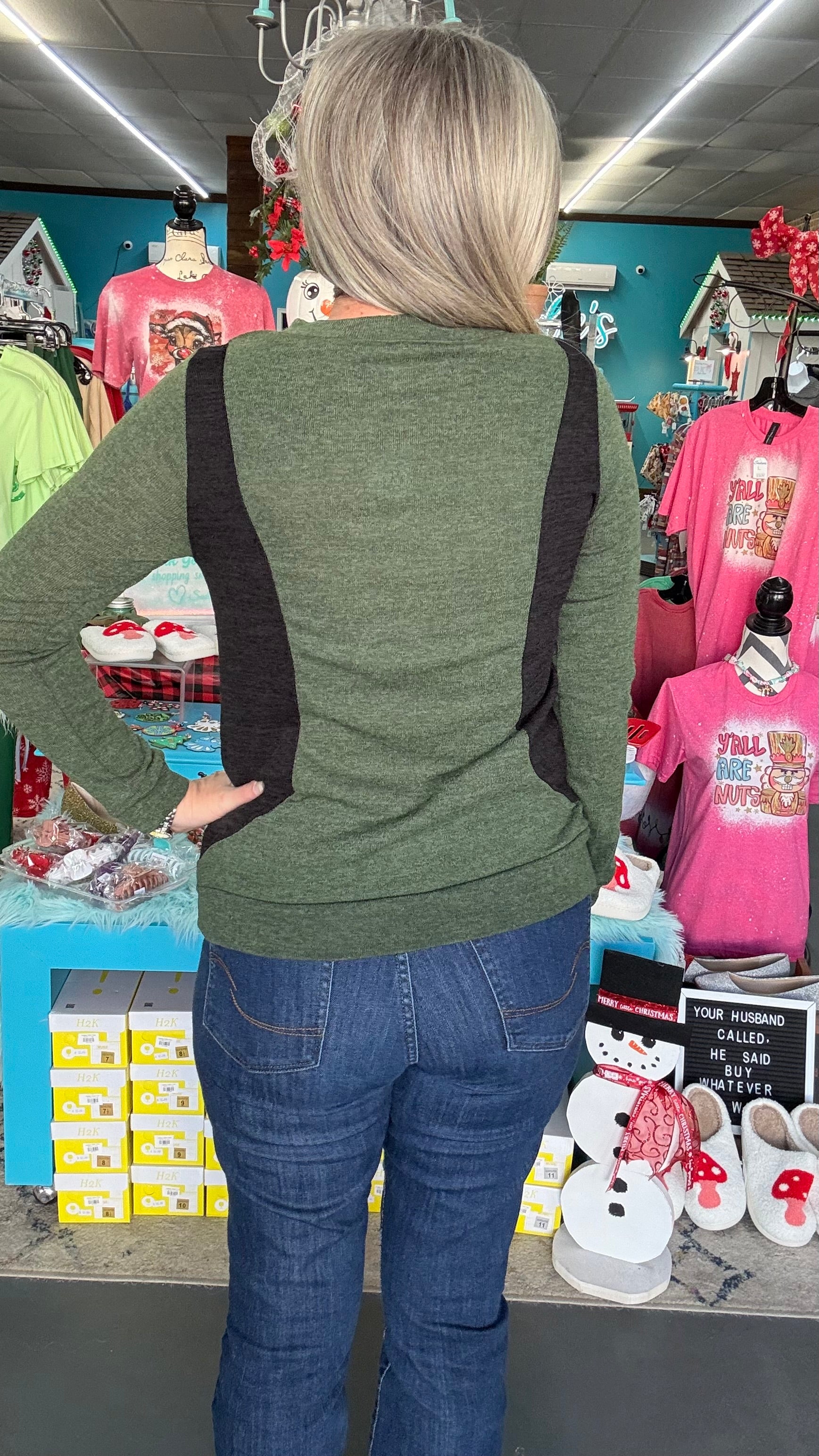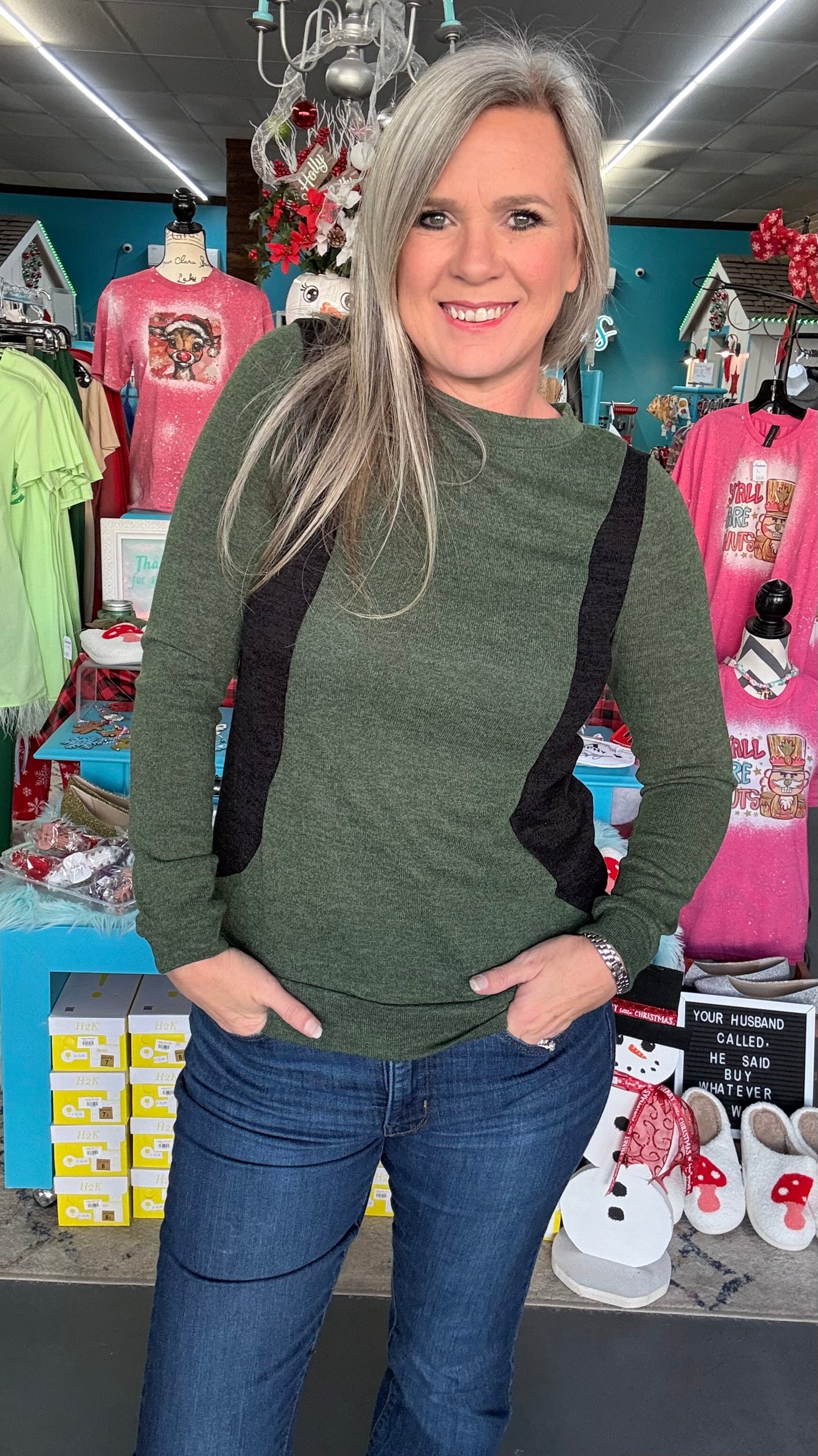 Made by Emerald. True to size fit. I’m wearing a small. Go up for a looser fit. 96% polyester 4% spandex. Banded waist and wrists.