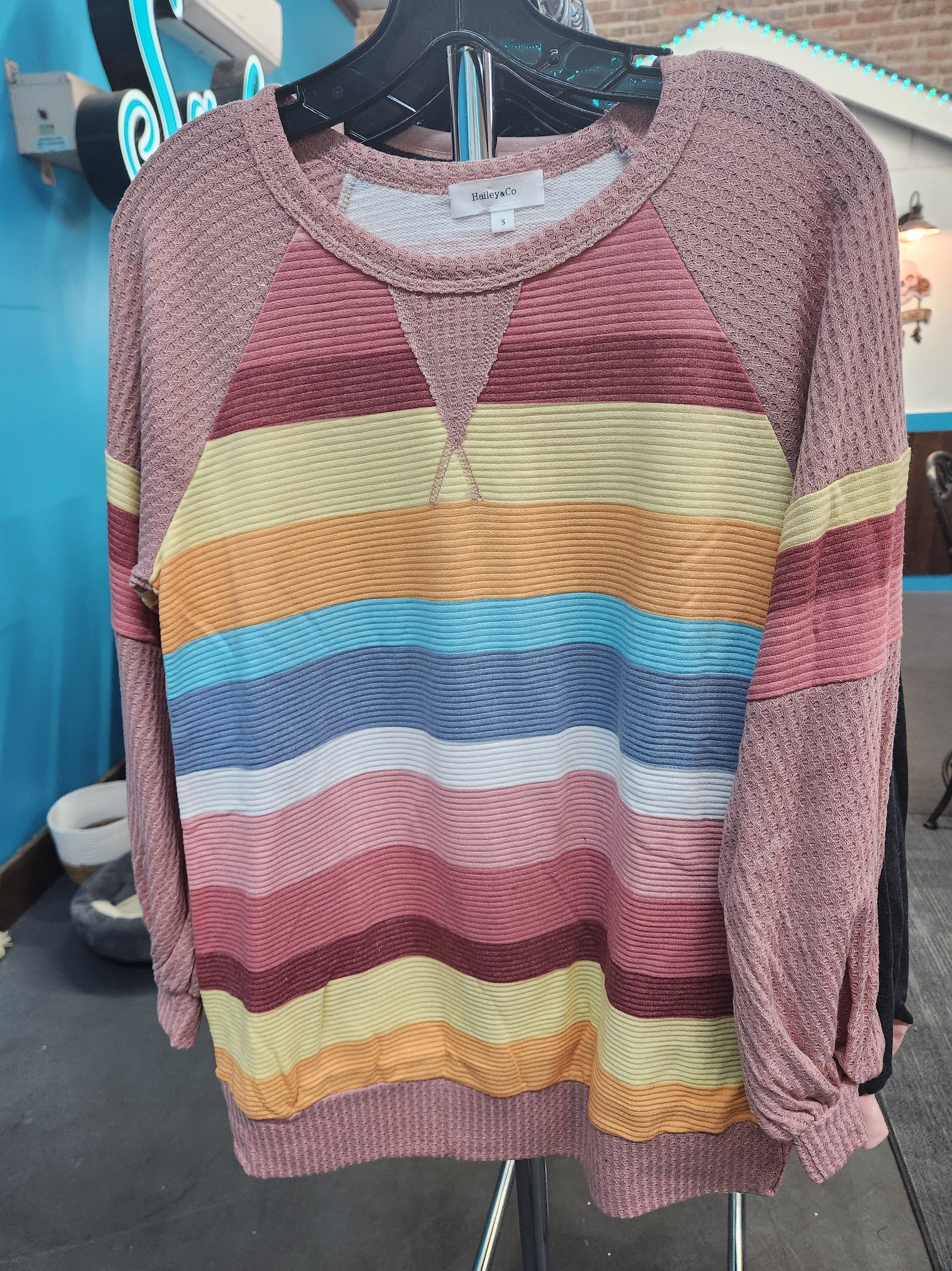Textured rainbow knit top with contrasting solid waffle sleeves and neck band